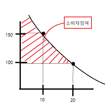 (ex) 소비자가 150원까지 지불할 용의가 있었는데 실제 금액이 100원일 경우 50원이 소비자 잉여라고 표현함.