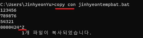 | 1. copy con [파일명] : 파일 생성 - 파일 내용 입력 (Enter는 줄바꿈) - [Ctrl+Z] 입력하면 저장하면서 종료 (예1) 명령어 입력 ![]() (예2) 실제 생성된 배치 파일 ![]() |