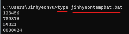 | 2. type [파일명] : 파일 내용 확인 (예) 위에서 생성한 배치 파일의 내용 확인 ![]() |