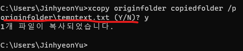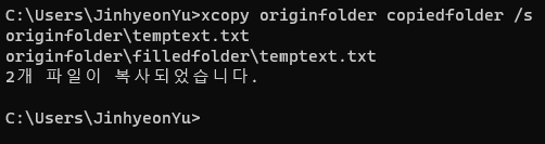 | XCOPY | 모든 티렉토리와 파일 복사 (숨긴 파일과 시스템 파일은 복사를 못함). 만약 복사 대상 디렉토리가 존재하지 않을 경우 디렉토리를 자동 생성한다. (ex) xcopy originfolder copiedfolder 를 입력할 경우 originfolder 내에 모든 디렉토리와 파일을 copiedfolder로 복사한다. |