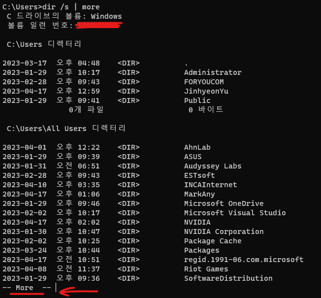 | MORE | 한 화면씩 내용 출력 (ex) dir | More => dir 결과들을 한 화면씩 출력하라. ![]() Enter를 누르면 한 줄씩 다음 내용을 표해준다. |
