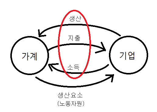 ![]() 가계에서 돈을 벌기 위해 노동자원을 기업에 제공을 하기 시작한다. 노동력을 제공함으로서 기업은 물품을 생산'(Product)'하고 그로인한 이득으로, 노동력에 대한 댓가로, 가계에 '소득(Income)'을 제공한다. 이로 발생한 재화로 가계는 필요 물품을 구매하는 등의 '지출(expenditure)'이 발생한다. * 그러므로 총생산(GDP, Gross Domestic Product)은 총지출(GDE, Gross Domestic Expenditrue)과 총소득(GDI, Gross Domestic Income)과 동일하다고 여기는 것이 '삼면등가의 법칙'이다. |